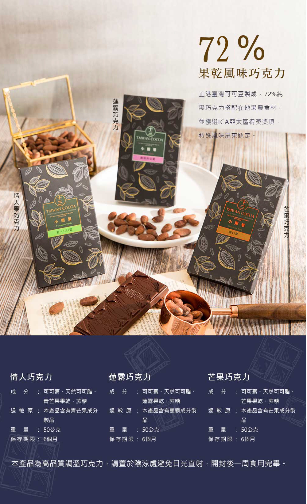 選用正港台灣巧克力製作,72%純黑巧克力搭配在地果農食材,並獲選ICA亞太區得獎獎項,特殊風味、屏東縣定。