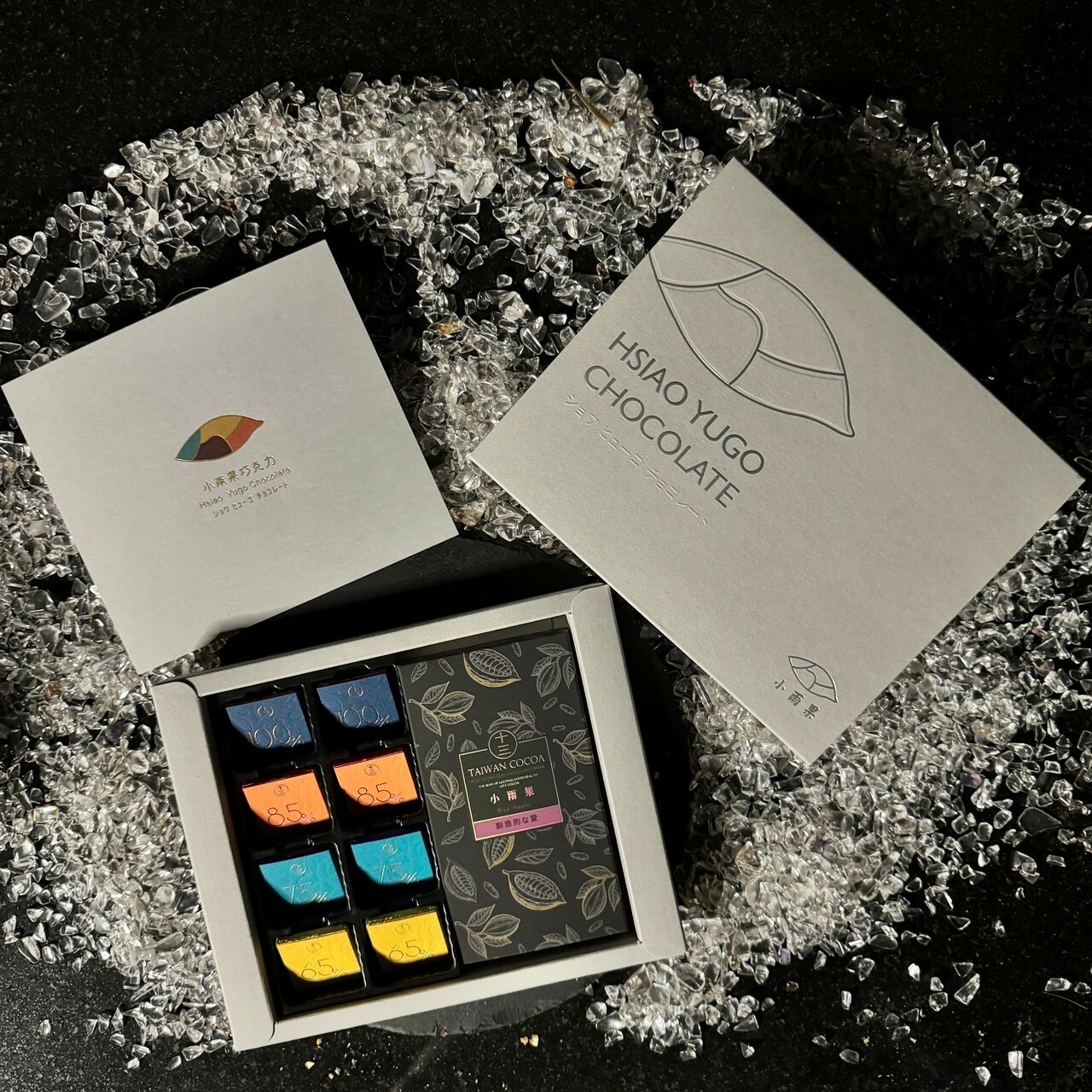 72%蓮霧純黑巧克力、72%芒果純黑巧克力、72%情人果純黑巧克力(三擇一),65%、75%、85%、100%純黑薄片巧克力各2片